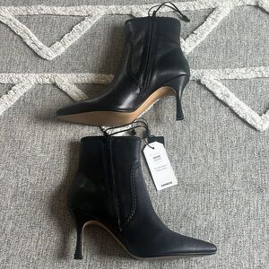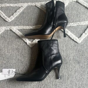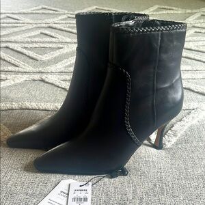 Genuine leather, Express black booties. Pointed toe with stiletto heel. Heel is 3.5 inches. Size 8 Women’s. Unique braided leather details! Never worn, two small scuffs shown in pics (must have come from shipping). No original box but will ship in padded shoe box.