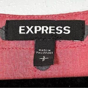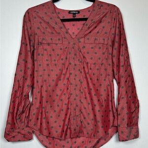 This Express blouse showcases a relaxed fit with a buttoned front, highlighted in a vibrant brick red shade with gray polka dots. The lightweight fabric and full-length sleeves ensure comfort and effortless style, perfect for any occasion. EUC. Pet and smoke free.