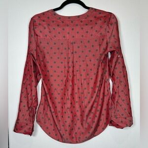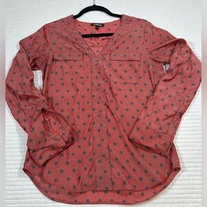 Express Brick Red Sheer Blouse w/ Gray Polka Dots. Buttoned Relaxed Blouse.