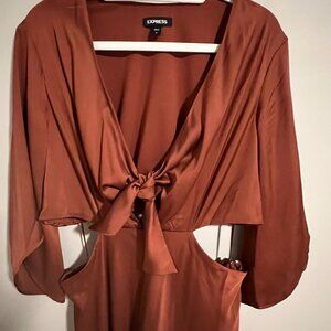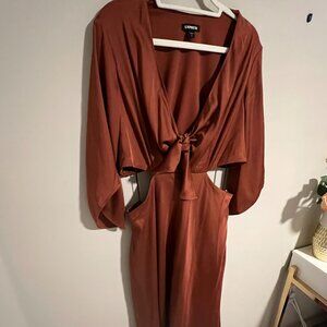 Step out in style with the Express Brown Maxi Dress, designed for cocktail nights and special occasions. This sundress features a striking plunge neckline and a chic tie-front detail, complemented by elegant 3/4 dolman sleeves. The cut-out accents at the waist add a touch of allure, making it a standout piece for any evening event.
