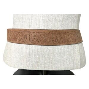 Express Brown Floral Tooled Leather Belt w Stone & Rock Buckle