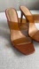 These Express brown heels feature a sleek and minimalist design with a square-toe silhouette and a single wide strap across the foot. Crafted from smooth, matte leather, they offer a modern aesthetic that combines elegance with casual sophistication. The slight platform adds a subtle lift, making them perfect for any occasion.
