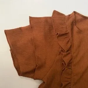 Chic brown top with ruffle details. Short sleeves. Length: 22” UA-UA: 18”