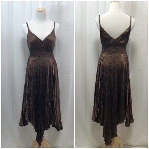 Express Brown Satin Pleated Handkerchief Hem Goddess Slip Dress, Size Small, excellent pre-owned condition, no issues, clean! Wide elastic smocking at rib cage, braided straps, pleated skirt, super nice! Chocolate brown in color.