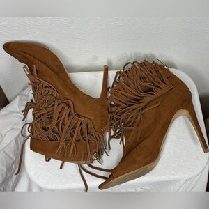 Express Brown Suede Leather Fringe Peep Toe Heeled Boho Western Booties Size 9