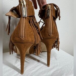Express Brown Suede Leather Fringe Peep Toe Heeled Boho Western Booties
