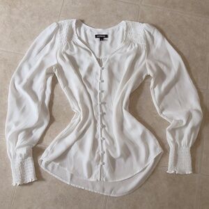 ON HOLD ☕️ pure white poet blouse. v neckline perfect option for any polished and professional elegant look. button details at front with tailored ruched sleeves
