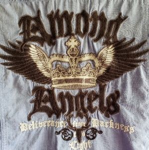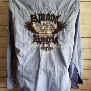 Mens lite Heather blue button down with embroidery design on front and back!