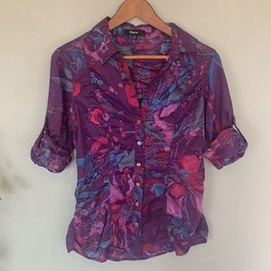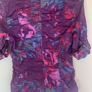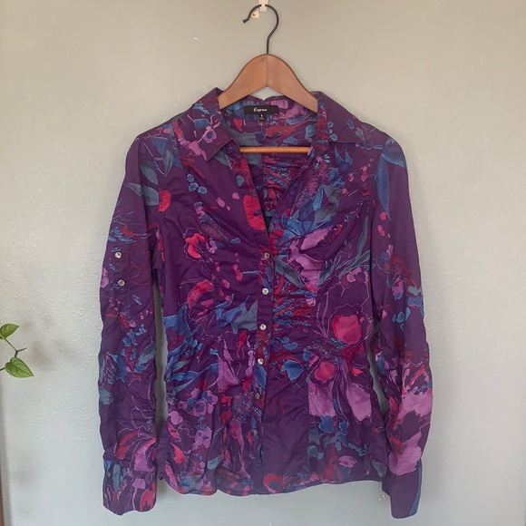 This purple and blue button down top from Express features some flattering cinched sides and back stitching (see pictures). Also, the long sleeve is adjustable by folding up sleeve and using the 3/4 and half sleeve buttons. 😍
