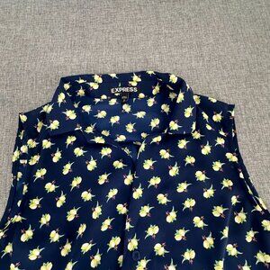 Express Button Down Top Sleeveless Navy Blue Yellow Lemons XS Lightweight Collar