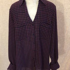 Has a cute square pattern with pink and blue in the squares. The shirt itself is a deep navy blue.