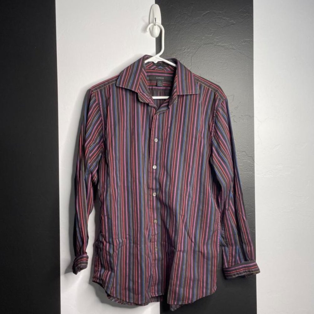 DETAILS: Black, red and pink vertical striped button up perfect for layering!