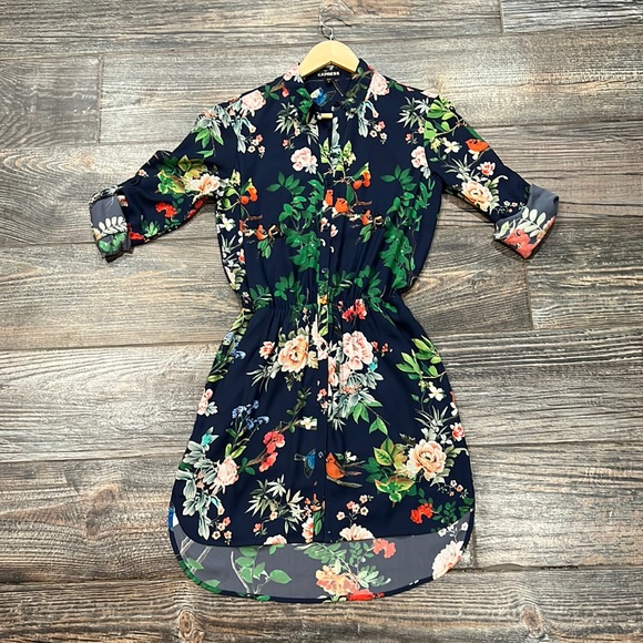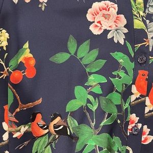 Featuring a beautiful colorful pattern of florals, leafy branches, and birds. Has a sewn in comfortable slip layer. Rolling button up sleeves can be rolled out to be worn as long sleeves.