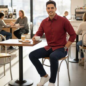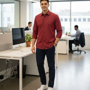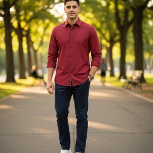 The Express Button Up Shirt for men in size L features a modern fit with long sleeves and a red pinstripe design, made of woven cotton fabric. Perfect for various occasions including travel, parties, casual wear, work, and business meetings, this shirt is machine washable and has a button-down style collar. With its classic and colorful theme, this button-up shirt is suitable for all seasons and can be styled in different ways to make a fashion statement. The brand Express ensures quality and style in this wardrobe essential.