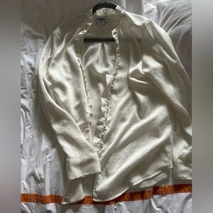 Beautiful white/ pearl button up blouse. It can be long sleeve or roll up sleeves