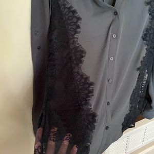 ~Super cute button-up shirt. Excellent condition. The lace details along the sides are in great condition, no rips or tears. Sleeves can be at any desired length. Lace detail is see through as shown