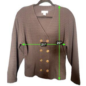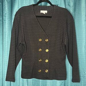 Pre-loved vintage 1990s Compagnie Internationale Express cardigan, made in Hong Kong, size L. This classic black knit ribbed striped top features eight gold crest buttons in a double-breasted front, a deep V-neckline, thin shoulder pads and a unique button-tab detail on the back. Soft ribbed knit with light structure, perfect for layering or wearing as a statement piece. Retro old money aesthetic meets timeless sophistication.