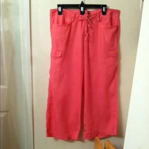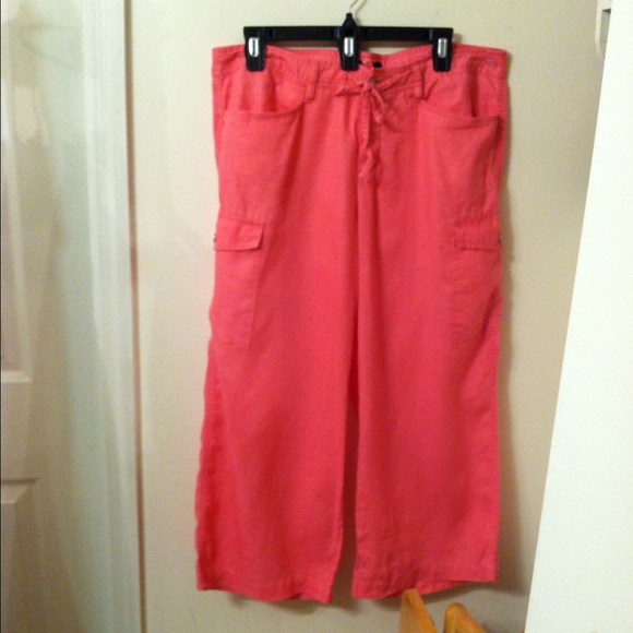 Express Capric pants100 percent Linent three buttons in front witha fake zipper a band around waste with six belt loop and. Draw string too deep pockets in front with buttons