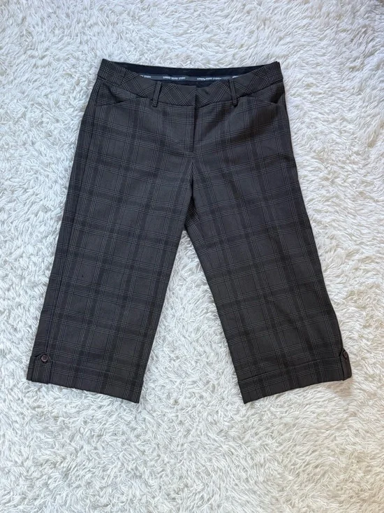 Vintage y2k brown plaid Express capri pants. Perfect fit for a low rise size 4 or a mid rise size 6. Has adjustable waist, zipper and clasp fly, functional pockets, and belt loops!