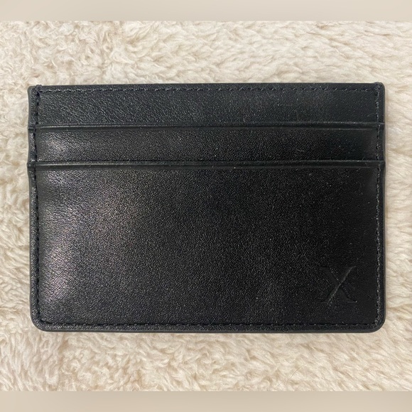 Express card wallet in black. Genuine leather wallet has two card slots on both sides and one card slot on top. Excellent condition. Never used.