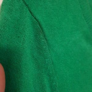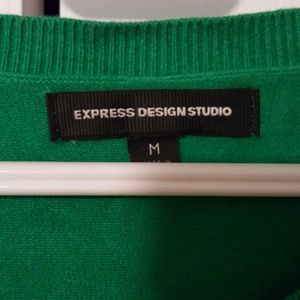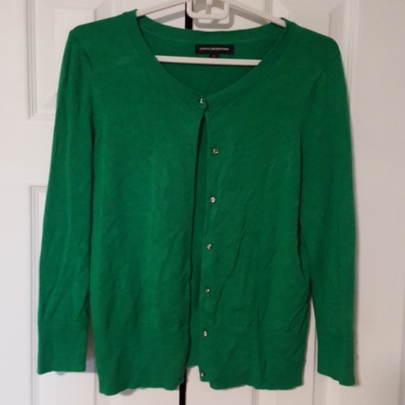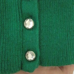 Express kelly green cardigan with rhinestone button details. Slight discoloration on one shoulder that might come out with washing (see photos).