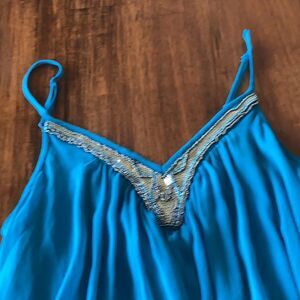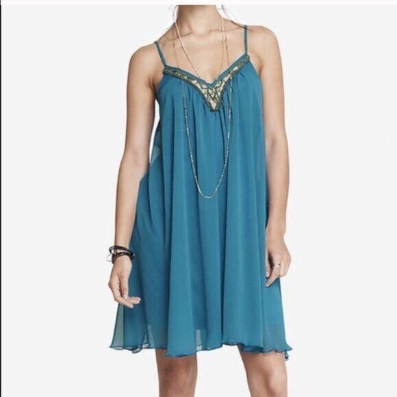 Excellent used condition Express caribbean blue flowy trapeze dress with a beaded bodice in size XS. This dress is very loose fitting so could also easily fit a size small (size small is tagged but please be aware the item is technically marked as extra small).