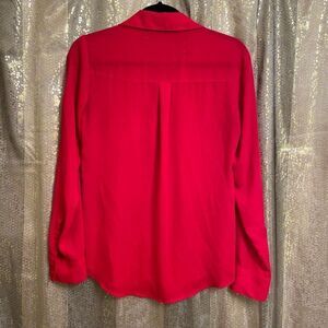 Gorgeous bright cherry red color! No flaws or signs of wear. This is perfect for the office, for Christmas and Valentines Day! The red shade is just gorgeous. Wish this fit me! Sleeves can be rolled up to wear a quarter sleeved look if you want. Smoke and pet free home. 100% polyester, no stretch. Size small, slim.
