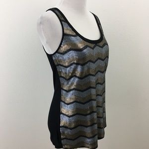 Tank top has gold, silver & black sequin in chevron pattern on front & back is a solid black. Content is 60% Cotton & 40% Modal. Measurements flat are approximately 15” pit to pit & 24” long. In excellent preowned condition with NO spots or damage.