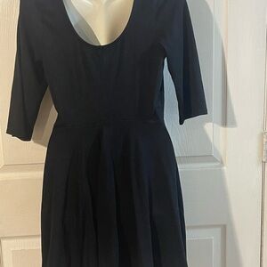 Stylish black mini dress with a scoop neckline. Features three-quarter sleeves. Ideal for versatile wear.