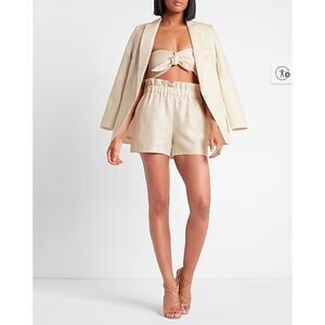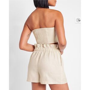Elevate your summer wardrobe with these chic Express Linen Blend Tie Front Bandeau Tops, brand new with tags. These strapless tops feature a stylish front bow tie and a smocked elastic back for a comfortable, flattering fit. Perfect for pairing with high-waisted jeans, shorts, or skirts for a breezy vacation or night-out look. For additional versatility, snip the tact in the center and retie to your preferred customization.