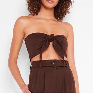 Express Chocolate Brown and Natural Sparkle Linen Blend Tie Front Bandeau Tops L