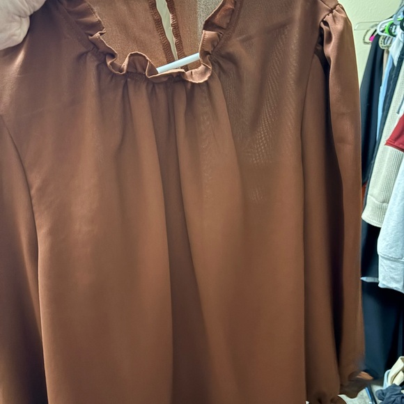 Chic chocolate blouse with ruffled neckline. Long sleeves. Versatile style.