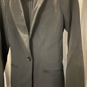 Sophisticated black blazer with a tailored fit. Ideal for professional and formal occasions. Features a single-button closure and sleek design.