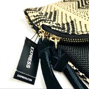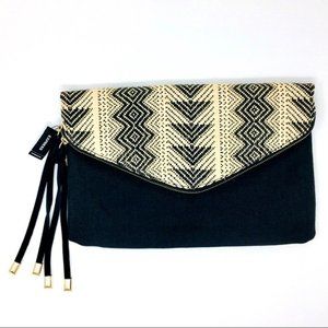 Express clutch purse. Envelope style. Black and cream. Raffia is woven into a tribal Aztec pattern. The body is made of fabric. Suede or faux suede accent strips feature gold-tone accent tips. Two interior pockets. Zip closure keeps contents inside. Additional magnetic closure keeps flap in place when folded over. Purse measures appx 13-3/8“ x 8-1/2“.