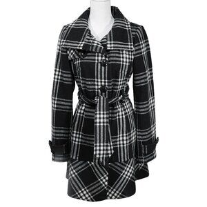 Express Coat Goth Plaid Black Wool Blend Funnel Neck Academia Pea Coat Mod Retro