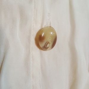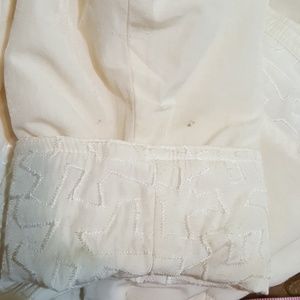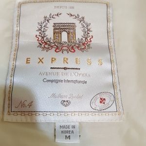 Very nice & warm coat by Express Compagnie International in winter white. Hooded w/fur lining that has buttons so that fur can be removed. Coat zips in front, then buttons over the zipper. It ties at the bottom. Deep front pockets. Approx 32" long. "Glacier Shield Feather Touch Insulation". Tag says size Med. but fits more like a large, IMO. Flaws: See pic 7. Button hole has small tear. Minor pilling here & there but not bad. Left sleeve has small stains. Not bad. See pic 8.