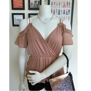 Express blouse. Flutter sleeves. Cold shoulders. Crossover deep V-neck. Spaghetti straps. V-back with tie to hold the shoulders up. Stretch peplum waist. Flowy poly material is whisper light, but lined for full coverage. Color is a shade of pink, what most would describe as "mauve".  Size extra small/x-small/xs, fits loosely. Pictured with other items from my closet for styling suggestions and inspiration!
