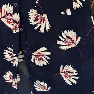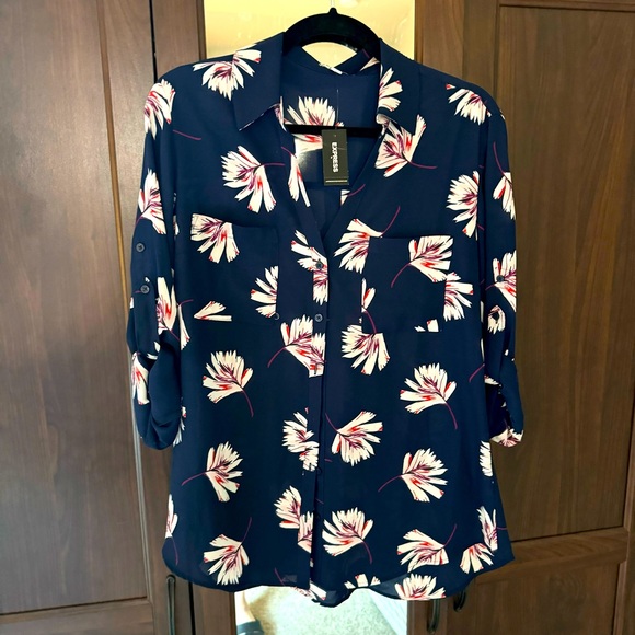 Express Collared Button Up Blouse 3/4 Sleeved - navy with pink and white flowers, slightly transparent, buttons to make 3/4 sleeved. Never been worn!