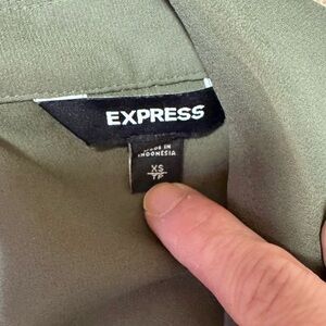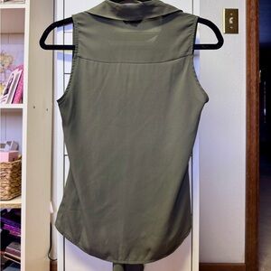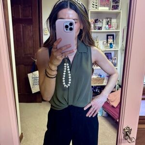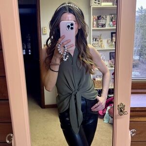 Elevate your style with this chic olive green tie-front top. Perfect for any occasion, this top offers a flattering fit and a modern look. Very flowy fabric that makes it extremely comfortable to wear. Can be dressed up or down, as pictured. You can tuck the tie into your bra and switch it up! Only worn a few times.