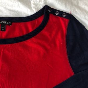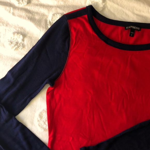 Express long-sleeve tee. Red body and Navy sleeves. Snap button details on the left shoulder. Body is jersey and sleeves are ribbed.