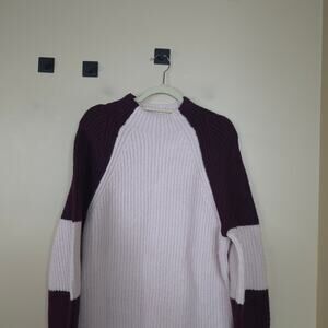 Sweater shift dress. Light pink and maroon colorblock long sleeves. Mock neck. Light pink body. Straight hem. Mini length. Oversized.