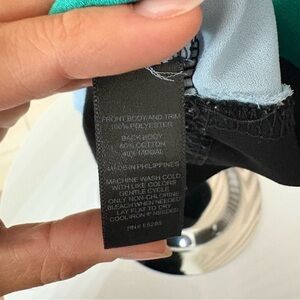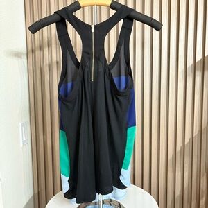 This Express racerback tank features bold color-block stripes in black, navy, teal, and light blue with a stylish gold zipper accent at the back. The lightweight fabric is perfect for layering or wearing alone for a casual, modern look.