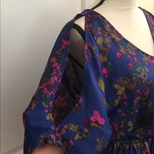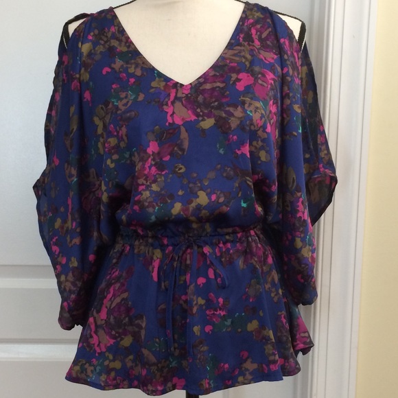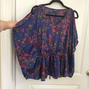 Flowy, silky, cold shoulder/split sleeve (goes to about the elbow), cinch-waist, colorful Express top. Absolutely gorgeous dressed up or down!! Size small, BNWOT