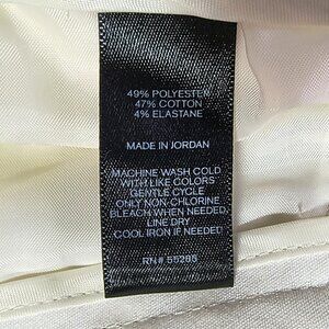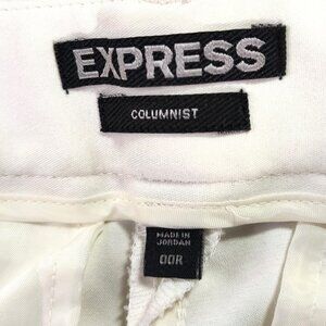 Express Columnist White Dress pants are stretchy, fitted through hip and thigh. Double hook and button closure, 5 belt loops. Size 00. Inseam 28 inches. Front and back pockets. Made in Jordan. ID#90247. 06/16
