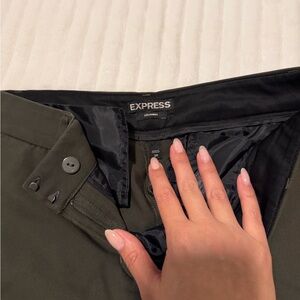 Classic straight barely boot leg silhouette with a smooth dark olive finish. Clean waistband and button closure. Lined interior for comfort. Versatile piece for work or events.