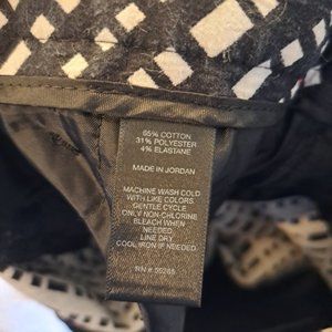 Excellent condition ankle-length pants. Black and white patterned with good stretch. Size 0. Measures about 15 inches across the waist, 8.5 inch rise and 30.5 inch inseam.