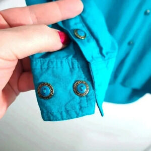 Express Compagnie Internacionale Women's Small S Teal Vintage Blouse Button-down and buttons at cuffs. Beautiful top in teal blue-green; a really flattering color. In good pre-owned condition with no rips or stains. Please see photos and video. Extra buttons sewn on inside of shirt. Ready to go from our smoke-free home 🏡