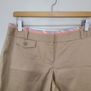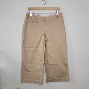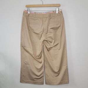 Wide leg cropped pants in a tan khaki color. Fun striped detail on waistband. There is a small spot on the leg as shown in the last photo.