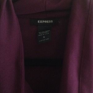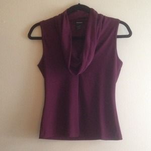 Dark purple cowl-neck blouse.