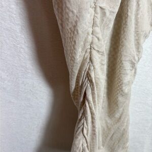 Elegant Express Tank Top has a soft Beige Snakeskin front and Animal print Embellished Gold-tone Sequins area around collar with stretchy Ruching on sides. It has loop keyhole back closure.